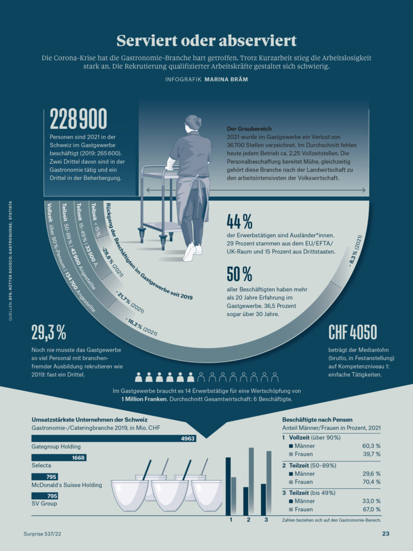 «Was heisst das schon: das Geld reicht? Nein, es reicht nicht. Aber ich komme zurecht.» Aynur, die ihren echten Namen nicht nennen möchte, bekommt den Mindestlohn. Als Ungelernte beträgt dieser laut Gesamtarbeitsvertrag für die Gastrobranche 19 Franken die Stunde, je nach Kanton werden bis zu 23 Franken gezahlt. Die Anfang-Vierzigjährige arbeitet in einem Personalrestaurant. Diese in der Regel nicht-öffentlichen Gastrobetriebe verpflegen die Mitarbeitenden grosser Unternehmen. Zusammen mit Kantinen, den Caterern für Altersheime und Spitälern sowie der Militärverpflegung gelten sie als Betriebe sogenannter Gemeinschaftsverpflegung.