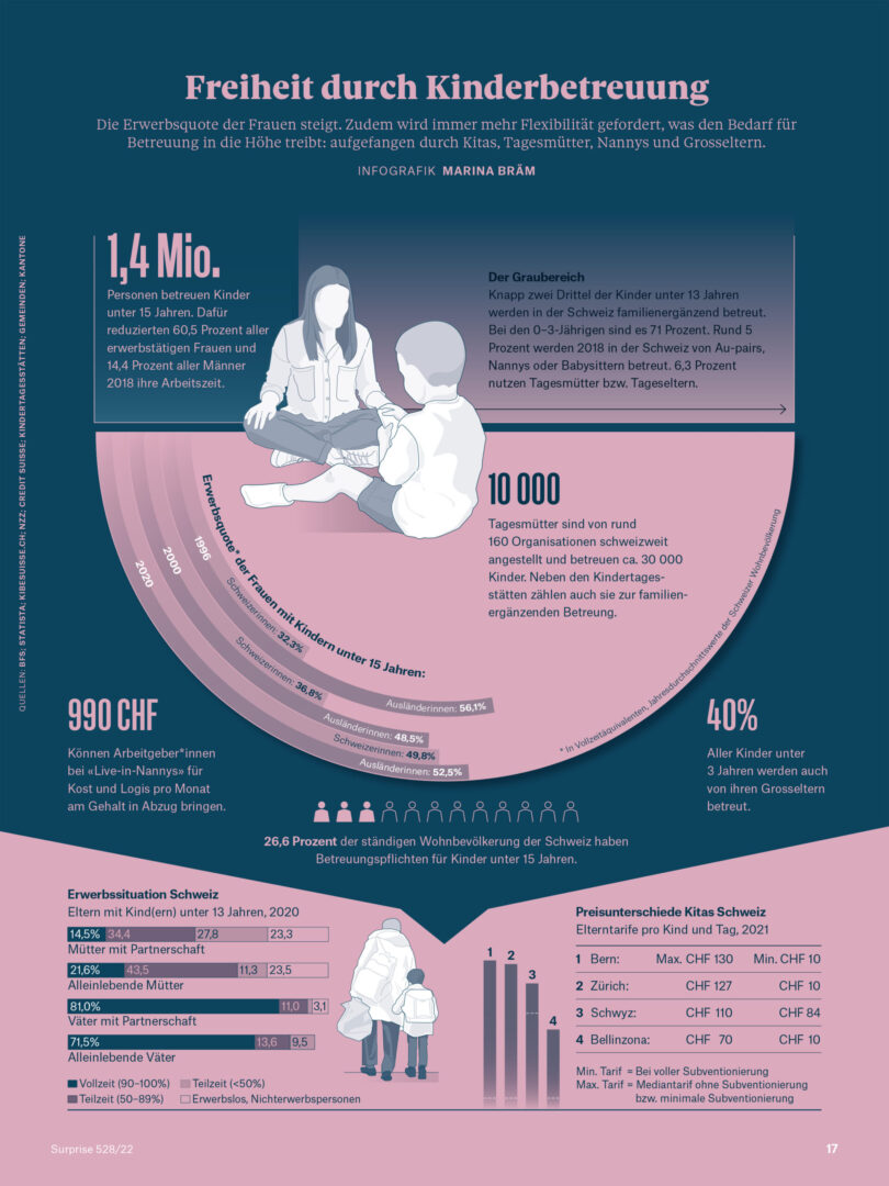 Vogts Situation dürfte eher die Ausnahme sein: Sie ist bei der hauseigenen Nanny-Vermittlung einer lokalen Kindertagesstätte angestellt und dort sozialund unfallversichert. Der Lohn wird monatlich auf ihr Konto überwiesen, selbst dann, wenn die Familien zu spät bezahlen. Zwischen 24 und 30 Franken pro Stunde – je nachdem, wie viele Kinder auf einmal sie betreut. Die Familien bezahlen zusätzlich für die Vermittlung und die Administration, die von der Kindertagesstätte übernommen werden. Die meisten Kinderbetreuerinnen in Privathaushalten sind von den Familien direkt angestellt. Unter anderem wegen dieser oft informellen Arbeitsverhältnisse ist über die Situation von Nannys in der Schweiz wenig bekannt. Es gibt nur eine Handvoll wissenschaftliche Untersuchungen zum Thema. Auch die Gewerkschaften tappen weitgehend im Dunkeln, denn Nannys sind schlecht vernetzt. Die meisten von ihnen sind Einzelkämpferinnen.