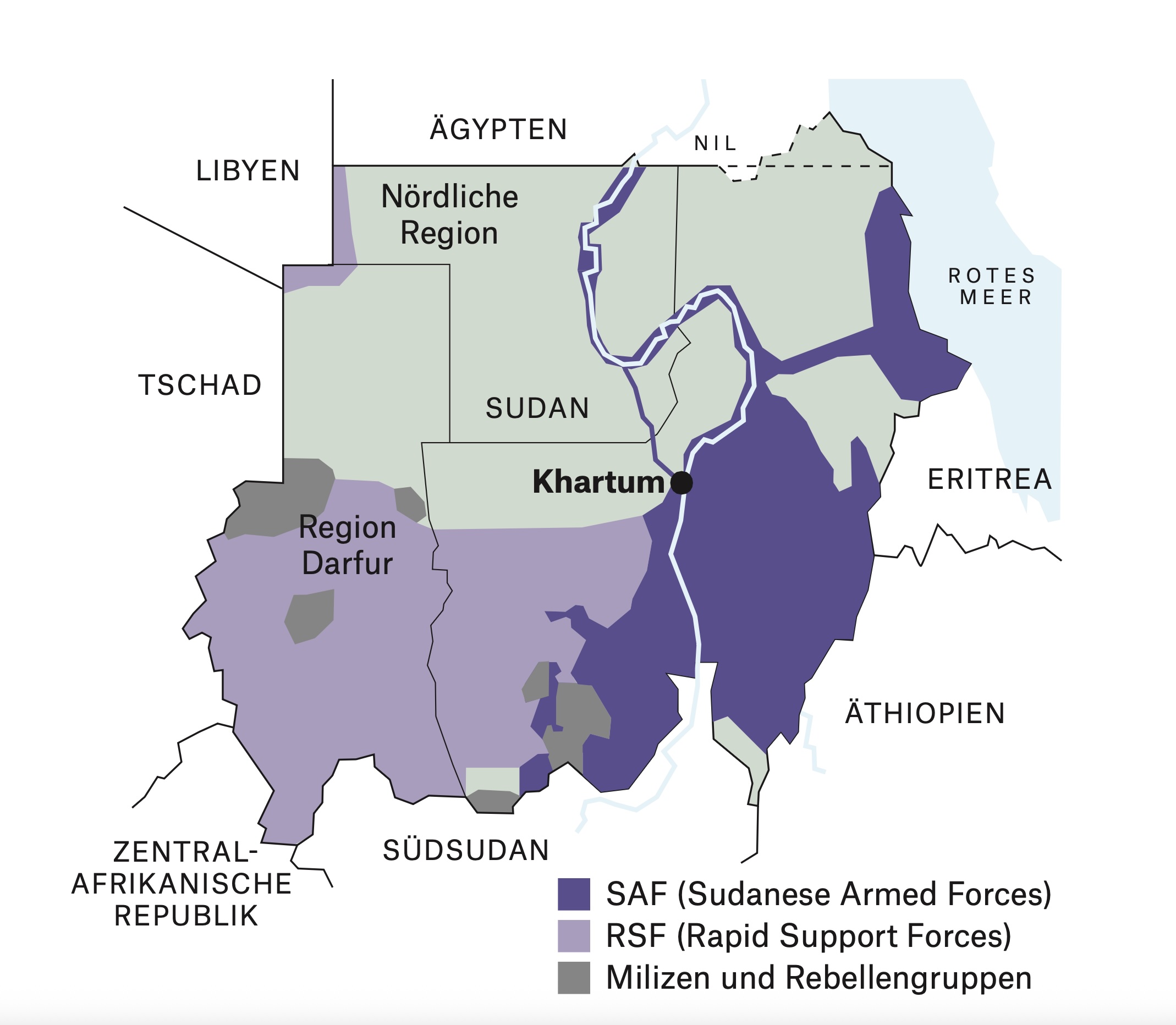 Heute ist der Sudan faktisch ein gespaltenes Land. Die Armee hat erst nach fast zwei Jahren und nur mit Hilfe verbündeter Milizen die Hauptstadt Khartum von den RSF zurückerobert. Sie ist ein Trümmerfeld, die Ruine des Präsidentenpalastes steht symbolhaft für den katastrophalen Staatszerfall. In einem militärischen Patt herrschen Himedtis RSF über die westliche Hälfte des Sudan, die Junta von General Burhan über die östliche. Millionen Menschen sind umso mehr vom Hungertod bedroht, da die reichen Staaten der Welt ihre Gelder für humanitäre Hilfsmassnahmen zusammenstreichen.