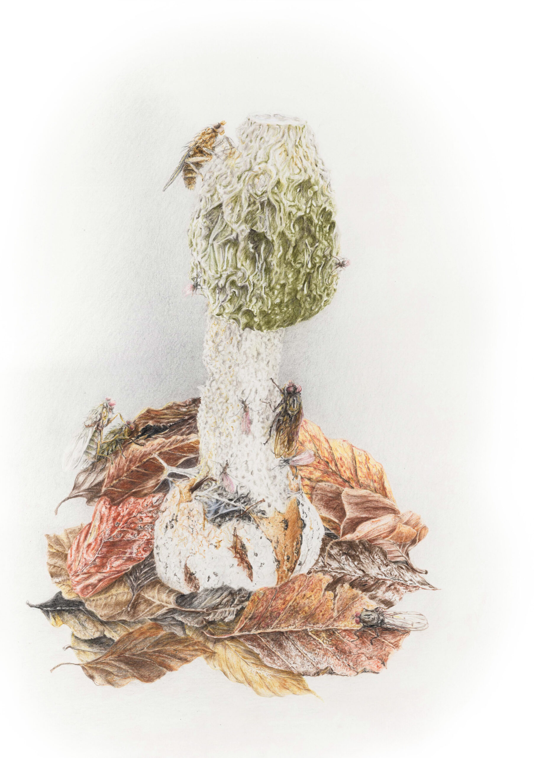 Stinkmorchel –Der Pilz wächst in Mischwäldern ab Frühling bis Spätherbst als «Ei» (nur dieses ist essbar), erst später erfolgt das Längenwachstum und dann setzt der aasartige Gestank ein. Achtung: Der tödlich giftige Knollenblätterpilz wächst aus einem ähnlichen «Ei». Illustration: Gerd Kleine-Bley