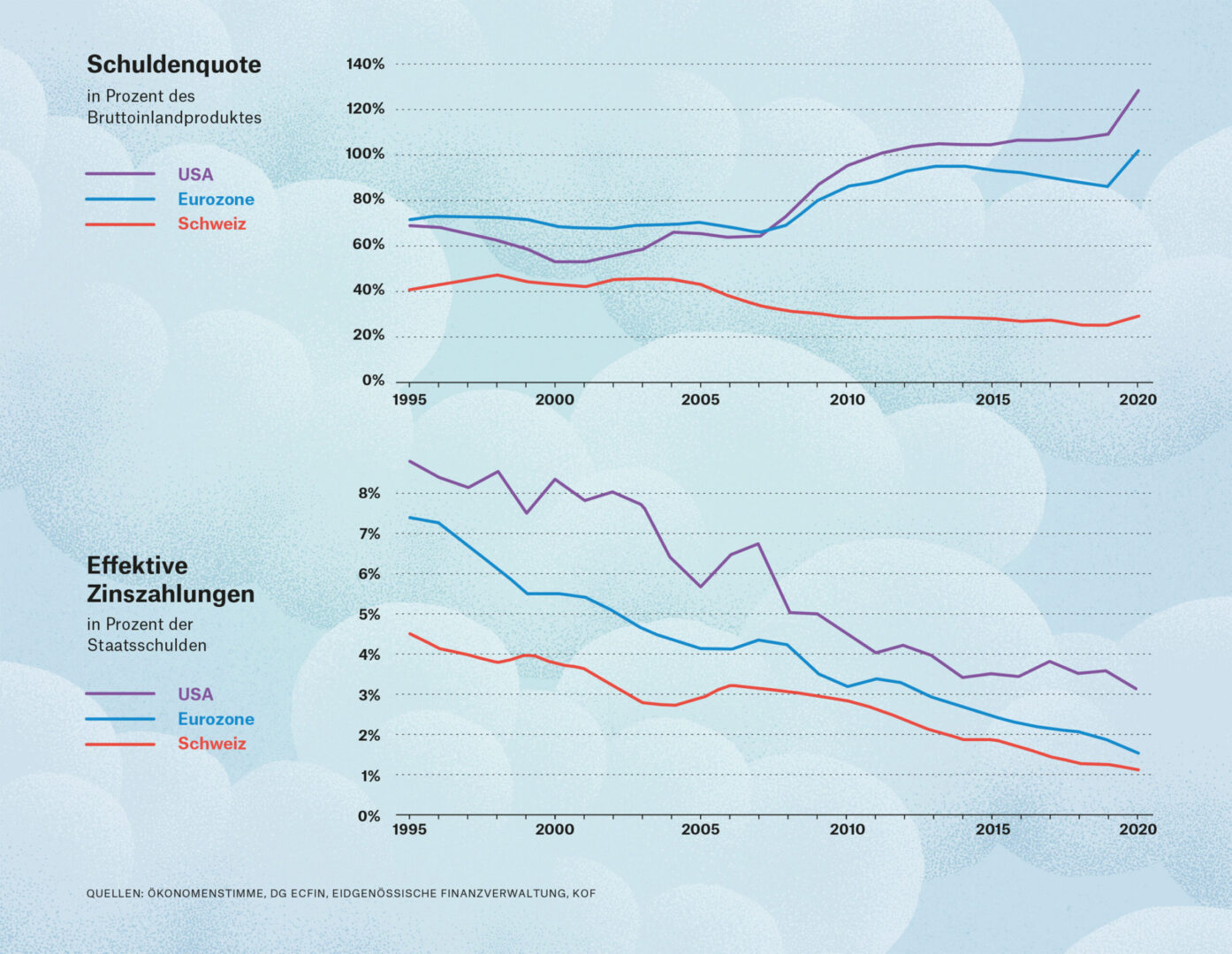 Die USA sind derzeit mit über 108 Prozent ihrer Wirtschaftsleistung, die Länder der Eurozone mit rund 100 Prozent und Japan sogar mit fast 235 Prozent verschuldet. (Japan ist anders als viele andere Länder in erster Linie im Inland verschuldet. Das bedeutet, dass die Schulden lediglich auf die zukünftigen Generationen von Japaner*innen übertragen werden und das Land nur wenig von der Gunst ausländischer Gläubiger abhängt.) Für die Schweiz liegt der Wert in diesem Modell bei knapp 30 Prozent. Das bedeutet, dass wir von allen Einkommen, die innerhalb eines Jahres in der Schweiz generiert werden, ein Drittel für die Rückzahlung der Schulden aufwenden müssten, wenn man alles auf einmal zurückzahlen wollte. Und weil die Schweiz in den letzten 25 Jahren stetig Schulden abgebaut hat, wird die Bonität – so nennt man die Kreditwürdigkeit von Schuldner*innen – von Schweizer Staatsanleihen nicht unter der Neuverschuldung leiden. Ein Grundsatz für die Bestimmung, ob die Staatsverschuldung im problematischen Bereich liegt, ist die Fähigkeit, die Zinsen zu bezahlen. Sobald ein signifikanter Teil der Steuereinnahmen für Zinszahlungen draufgeht, kann es sogar dazu kommen, dass ein Staat sich neu verschulden muss, um seine laufenden Kosten decken und die Zinsen bezahlen zu können. Derzeit leben wir jedoch in einer Phase der Negativzinsen. Das bedeutet, dass den Schweizer Staat die neu aufgenommenen Schulden gar nichts kosten. Im Gegenteil, er verdient sogar noch daran. Können wir also doch immer mehr Schulden machen?