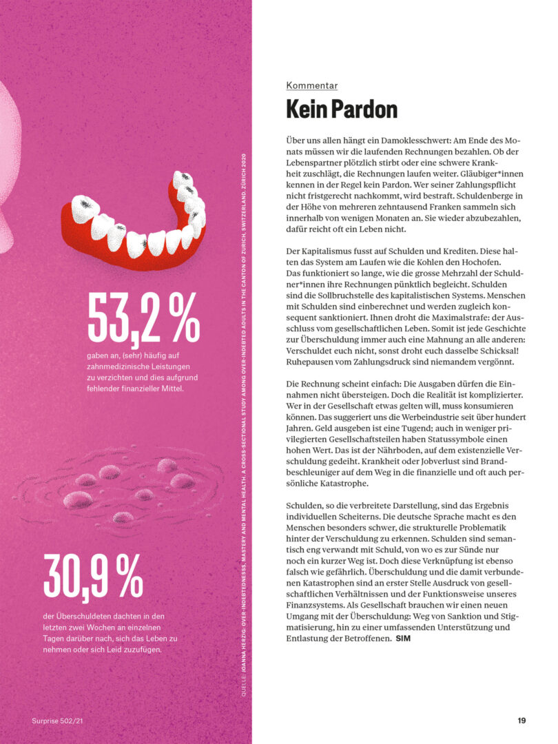 Der Kapitalismus fusst auf Schulden und Krediten. Diese halten das System am Laufen wie die Kohlen den Hochofen. Das funktioniert so lange, wie die grosse Mehrzahl der Schuldner*innen ihre Rechnungen pünktlich begleicht. Schulden sind die Sollbruchstelle des kapitalistischen Systems. Menschen mit Schulden sind einberechnet und werden zugleich konsequent sanktioniert. Ihnen droht die Maximalstrafe: der Ausschluss vom gesellschaftlichen Leben. Somit ist jede Geschichte zur Überschuldung immer auch eine Mahnung an alle anderen: Verschuldet euch nicht, sonst droht euch dasselbe Schicksal! Ruhepausen vom Zahlungsdruck sind niemandem vergönnt.